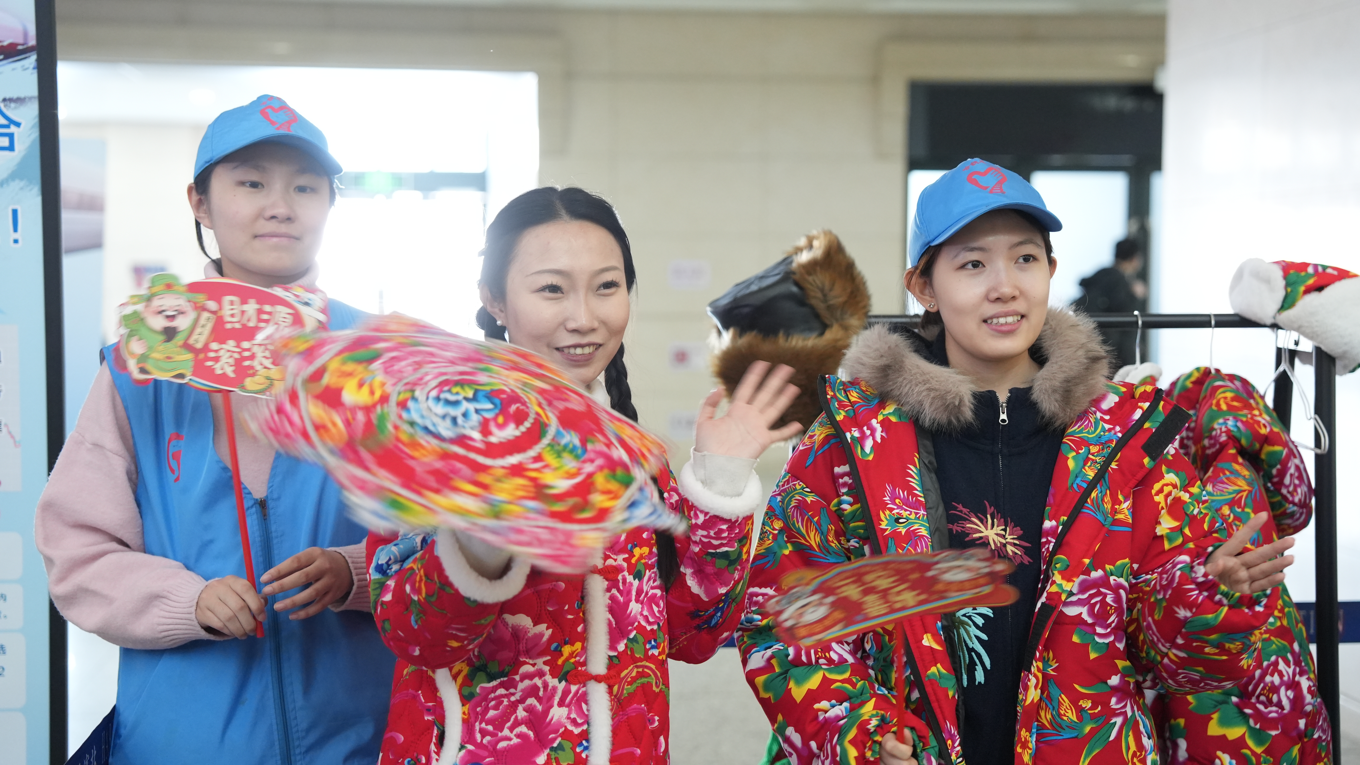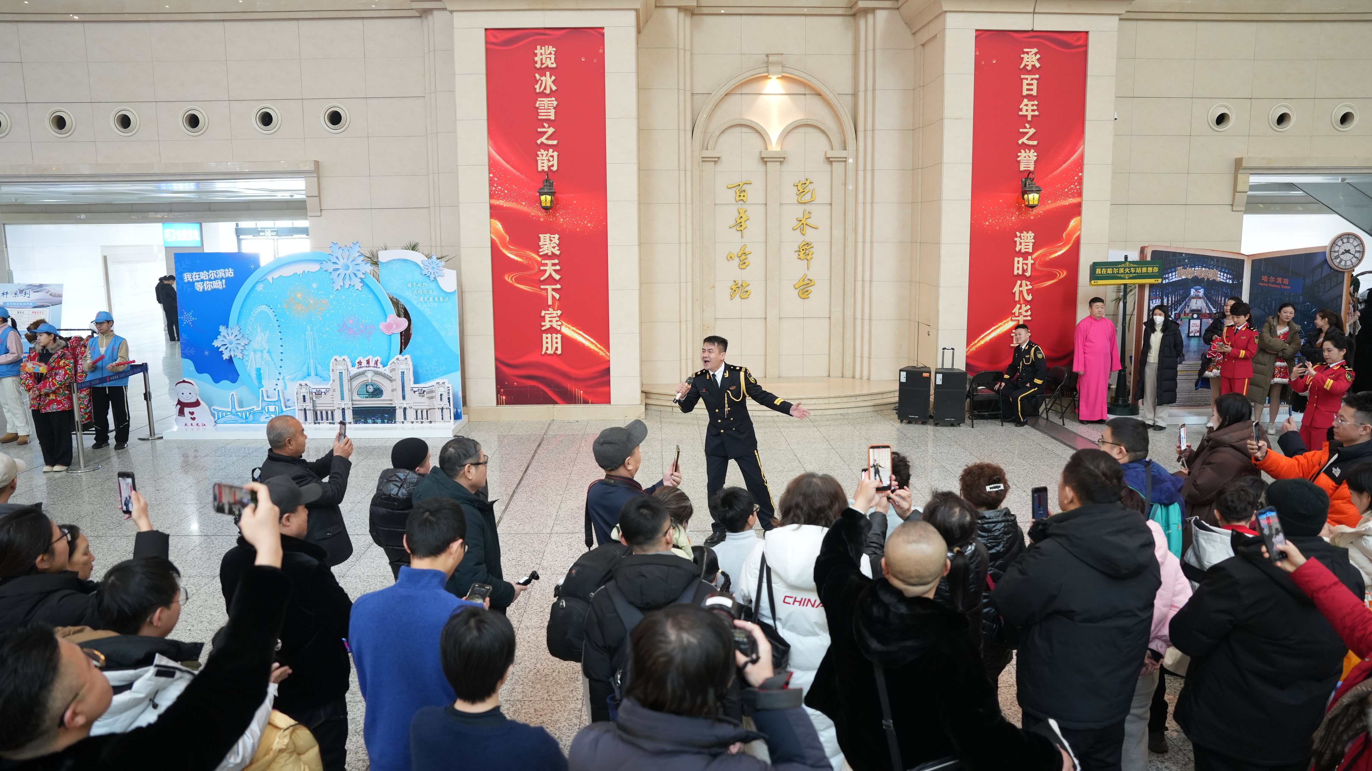 百年舞台旁的“魔法穿搭·定格你的专属瞬间”拍照区同样人气爆棚。两块风格迥异的主题背景板构成了独特的视觉空间:一块是冰雪覆盖质感的哈站站房实景图,搭配“我在哈尔滨火车站等你来”的温馨文案,适配浓郁东北风情的大花袄穿搭;另一块则将百年站房化作魔法世界场景,搭配奇幻风格的魔法服饰。现场免费提供的服饰道具,从色彩艳丽的东北大花系列外套、头巾,到带有魔法元素的斗篷、巫师帽,再到福字、灯笼、魔法棒等拍摄道具,满足不同旅客的个性化需求。来自贵州的张先生一家特意换上大花袄,在冰雪背景板前合影留念:“第一次体验东北特色穿搭,还能和孩子一起玩魔法变装,候车时间变得太有趣了!”孩子们则拿着魔法棒在镜头前摆出各式造型,欢声笑语弥漫在候车大厅。