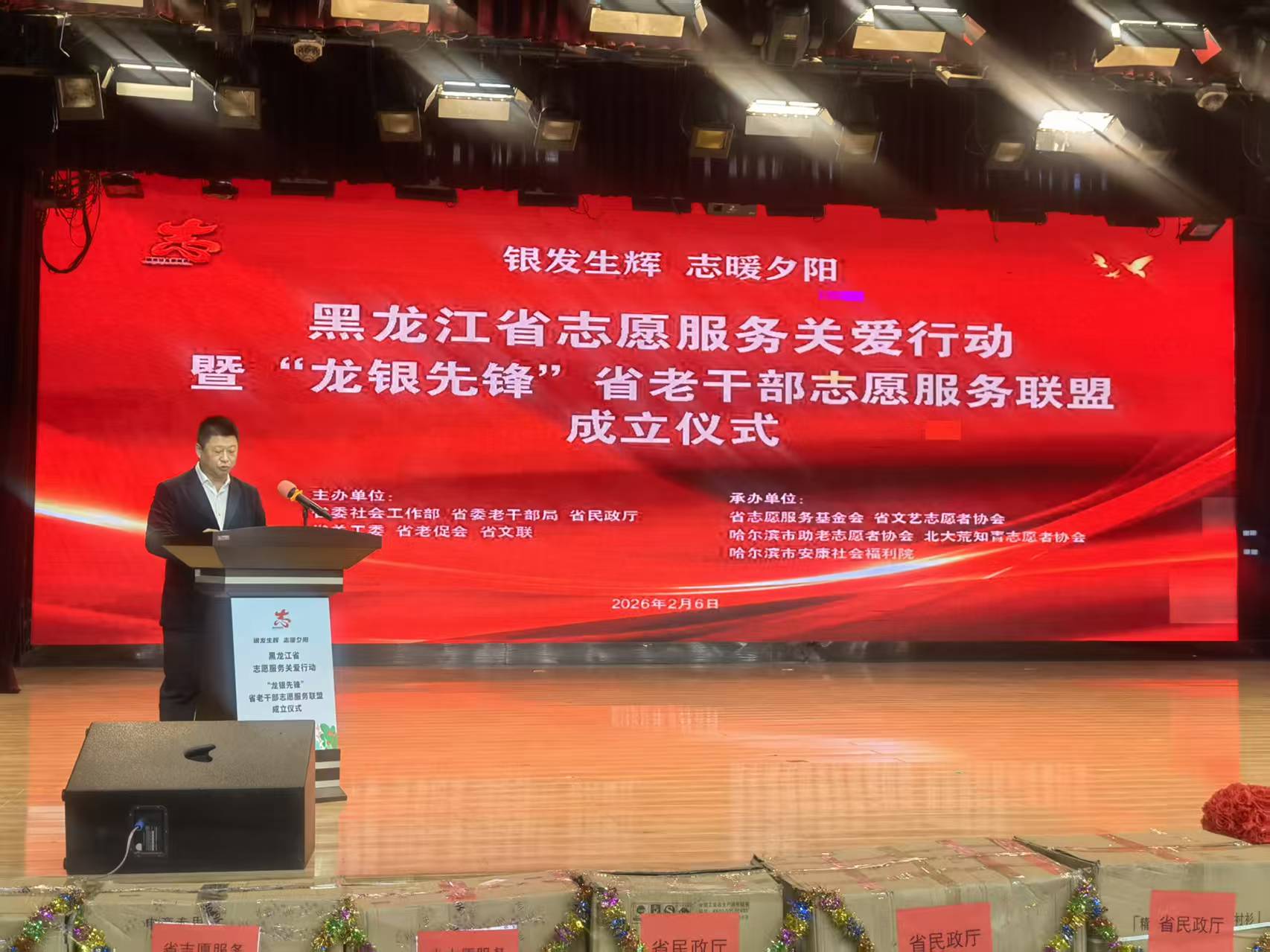 为落实中央社会工作部元旦春节期间志愿服务工作部署,聚焦“老小残困”群体急难愁盼,以志愿力量为老年群体送上新春祝福与温暖关怀。2月6日,“银发生辉志暖夕阳”黑龙江省志愿服务关爱行动暨“龙银先锋”省老干部志愿服务联盟成立仪式在哈尔滨市安康社会福利院举行。