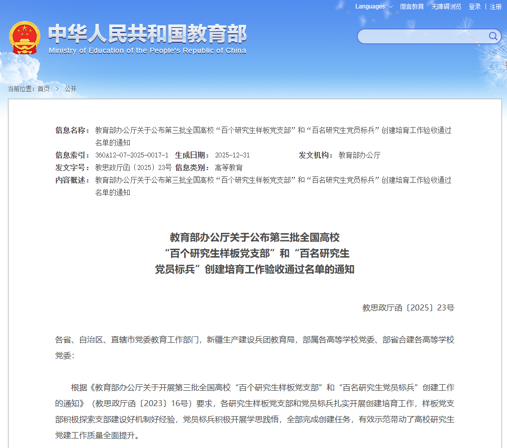 近日,教育部网站发布《关于公布第三批全国高校“百个研究生样板党支部”和“百名研究生党员标兵”创建培育工作验收通过名单的通知》,经高校评估总结、属地党委教育工作部门把关审核、教育部相关司局和单位审查、验收结果公示,最终认定100个研究生样板党支部和100名研究生党员标兵全部通过验收。其中,黑龙江高校2个党支部和2名同学上榜。