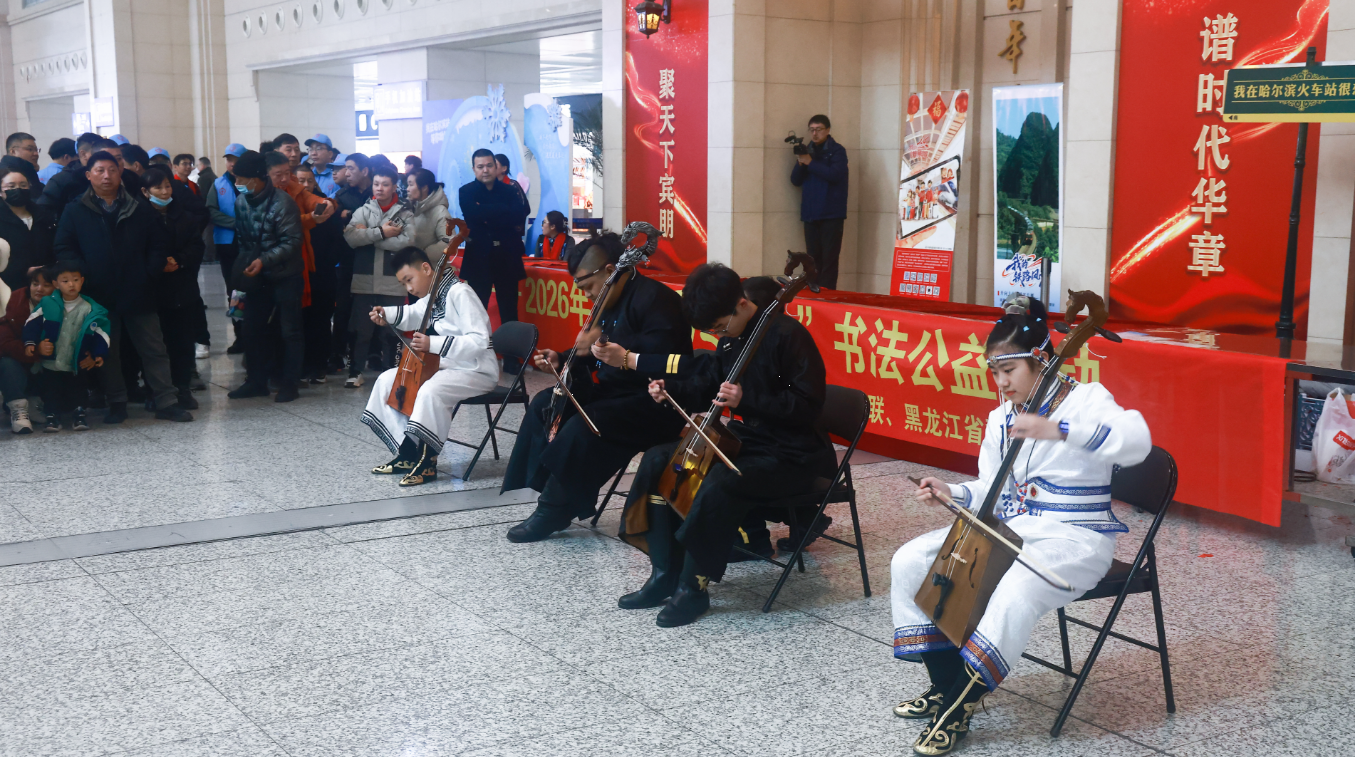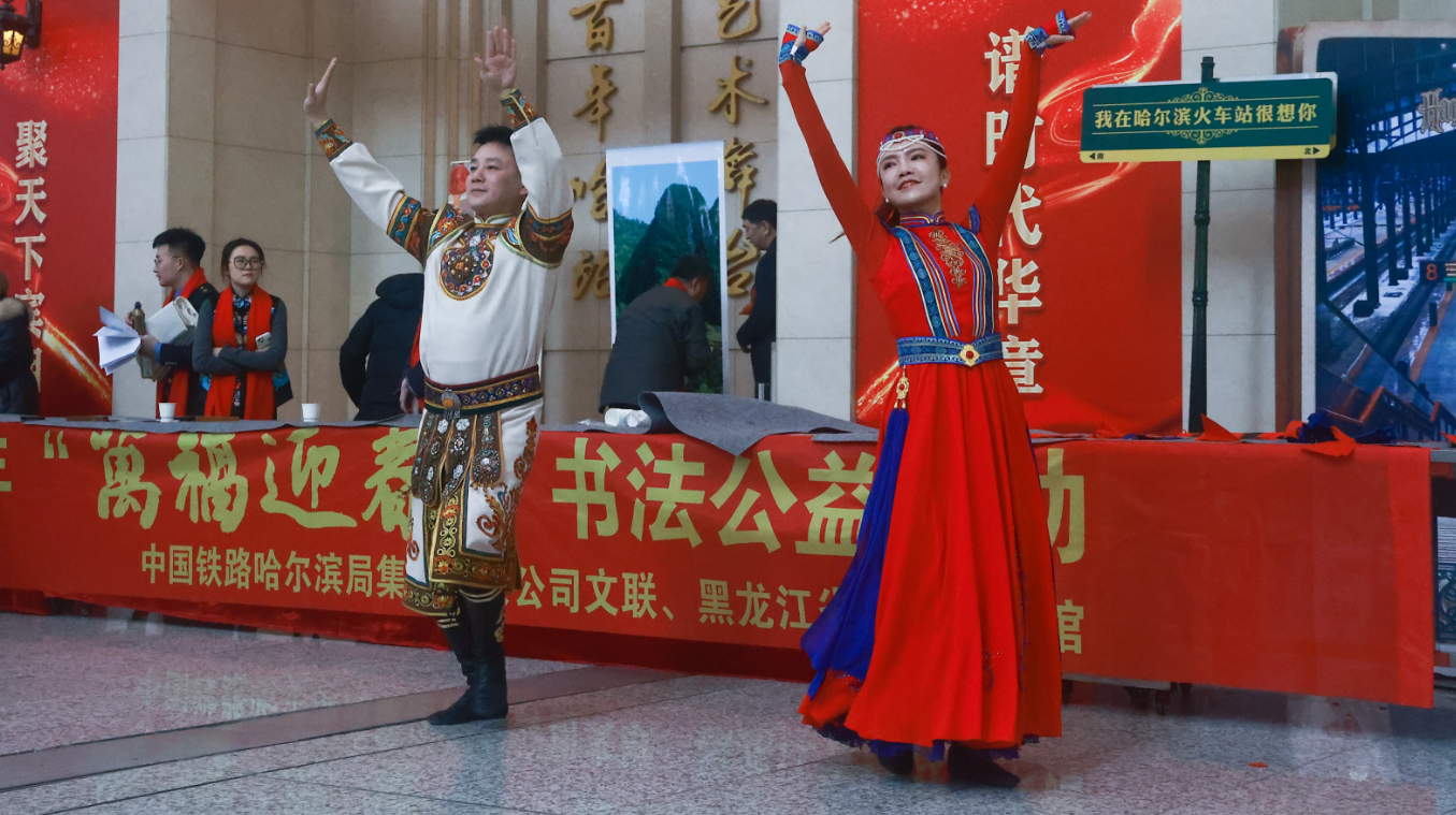 活动精彩纷呈、高潮迭起,文艺演出环节为现场群众带来了一场沉浸式视听盛宴,《我的东北老家》《坐上高铁逛东北》等歌曲唱出了东北人的豪迈与热情;地道的二人转小帽扭出东北年味;激昂的马头琴奏响新春乐章;灵动的舞蹈《白马》翩跹而至,以骏马奔腾之势喜迎马年新春;经典歌曲《塞北的雪》唱出了黑龙江冰天雪地里的美好生活,让候车间隙变得充实而愉悦。