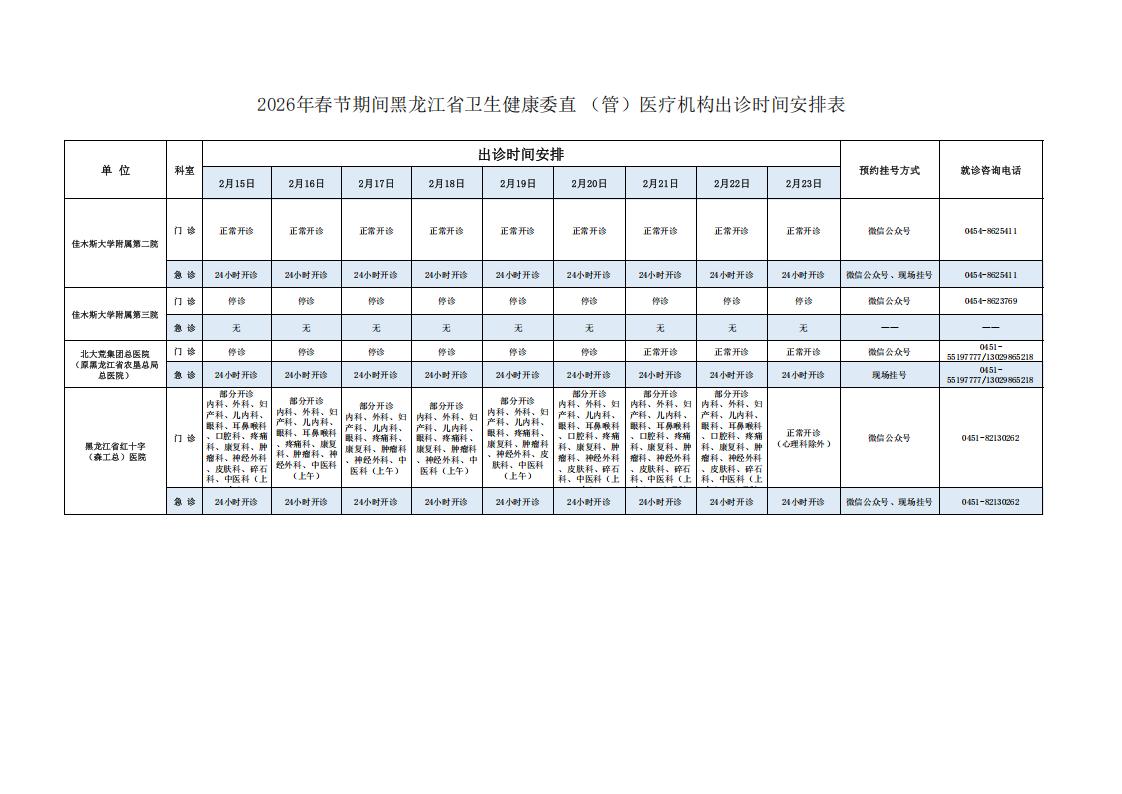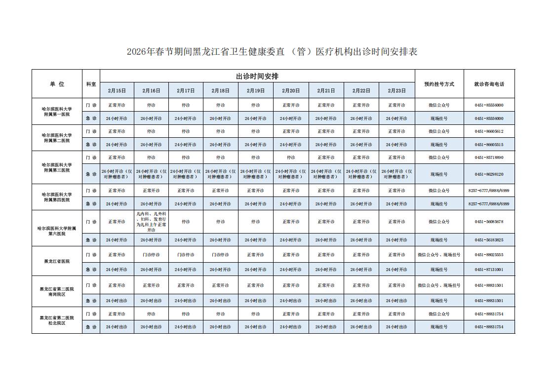 2026年春节期间黑龙江省卫生健康委直(管)医疗机构出诊时间安排表