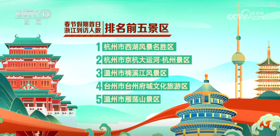 记者从浙江省文化广电和旅游厅了解到,2月14日14时到15日14时,浙江省全域旅游人数1158.7万人次。其中假期首日到访人数排名前五的景区是:杭州市西湖风景名胜区、杭州市京杭大运河·杭州景区、温州市楠溪江风景区、台州市台州府城文化旅游区、温州市雁荡山景区。