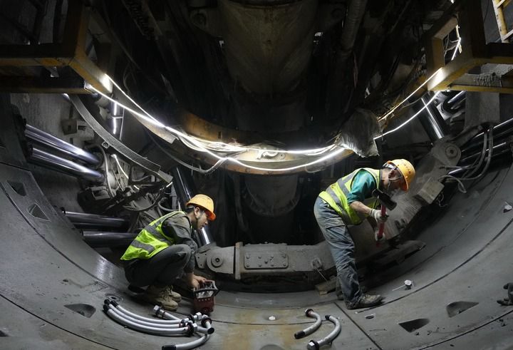 中铁十八局集团工人在石家庄市地铁5号线一期工程01工区建设工地施工(2025年10月24日摄)。新华社记者杨世尧摄