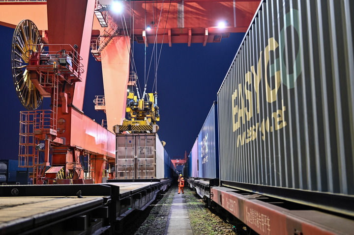 货运员在成都国际铁路港检查吊运的中欧班列集装箱(2026年2月16日摄)。新华社发(何海洋摄)