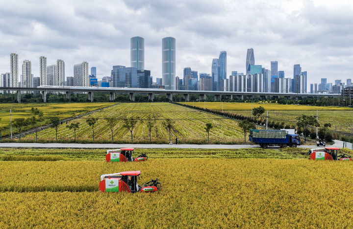 收割机在位于浙江杭州萧山区世纪田园粮食功能区的稻田里收割水稻,远处高铁列车飞驰而过(2025年10月21日摄,无人机照片)。新华社记者徐昱摄