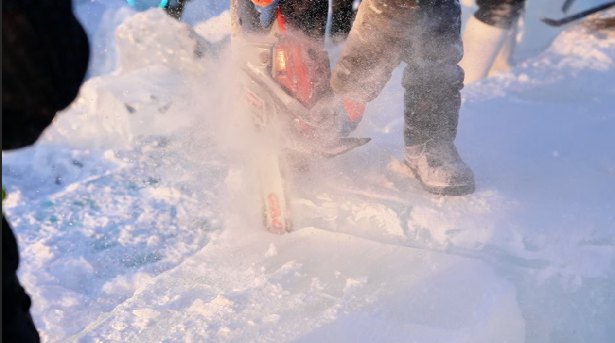 这些冰从松花江采出来,少则几百公斤,多则上千公斤!想要将大块“毛冰”,砌成几十米高的主塔、连绵的城堡城墙,得先切成规格统一的长方体冰砌块——也就是我们常说的“冰砖”,以前这道工序,全靠人。