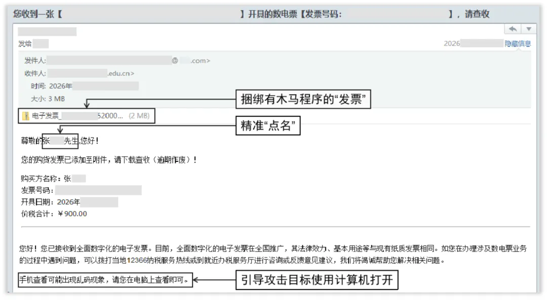 点击“发票附件”的瞬间,木马将自动入侵你的网络设备,攻击者不仅能够将计算机中的企业合同、项目资料、科研成果等敏感数据传至境外,还可通过监控键盘输入获取银行密码、系统凭证、个人隐私等信息,甚至能远程开启摄像头、麦克风,窥探办公环境,窃听语音信息。不但会给个人和单位造成不可挽回的损失,而且可能导致国家秘密泄露,损害国家安全。
