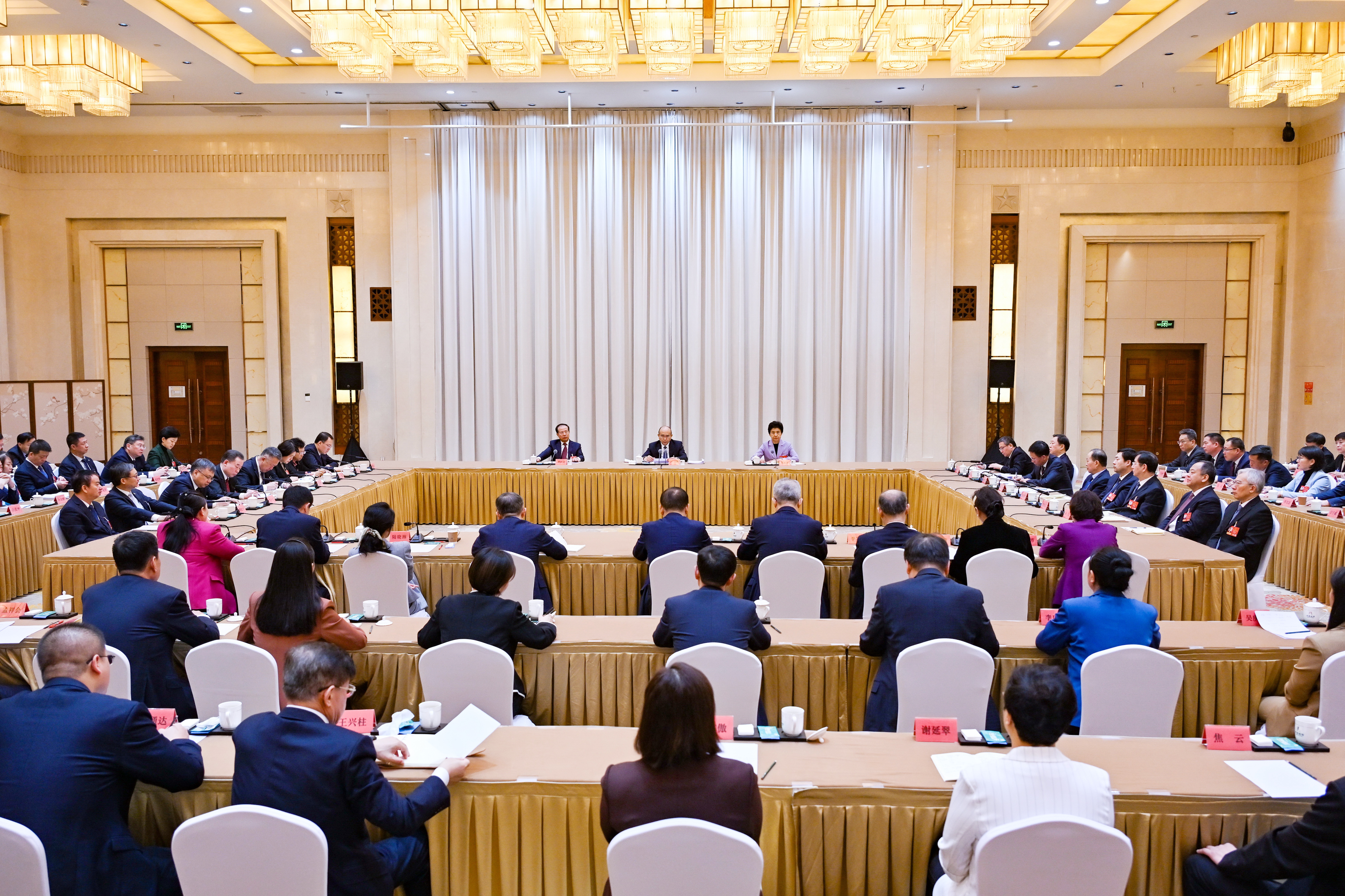 12日,出席十四届全国人大四次会议的黑龙江省代表团召开总结会议。代表团团长许勤讲话,副团长梁惠玲、于洪涛、贾玉梅、张起翔、丛丽参加。