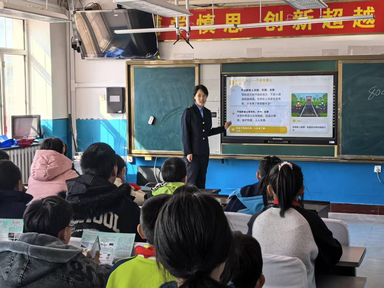 课堂的主角,是来自牡丹江供电段检修车间的青年志愿者韩璐璐。她站在讲台上,没有照本宣科,而是将生硬的安全规定,拆解成一个个与孩子们生活息息相关的问题:“那能在铁轨上玩捉迷藏吗?”“如果看到风筝挂到电线上,该怎么办?”……一双双小手高高举起,一张张稚嫩的脸庞在抢答中写满了认真。三十分钟的课,在情景模拟和欢声笑语中悄然流逝,而铁路安全的准则,已通过这种“听得懂的语言”,深深印在了孩子们的脑海里。