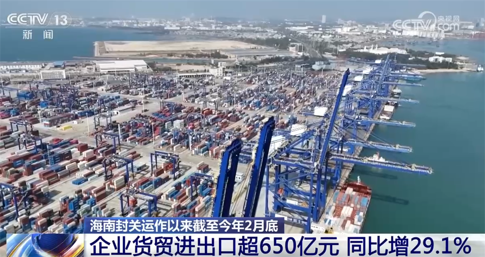 央视网消息:据海口海关统计,自2025年12月18日封关运作以来,截至2026年2月底,海南企业货物贸易进出口总额654.9亿元,同比增长29.1%。