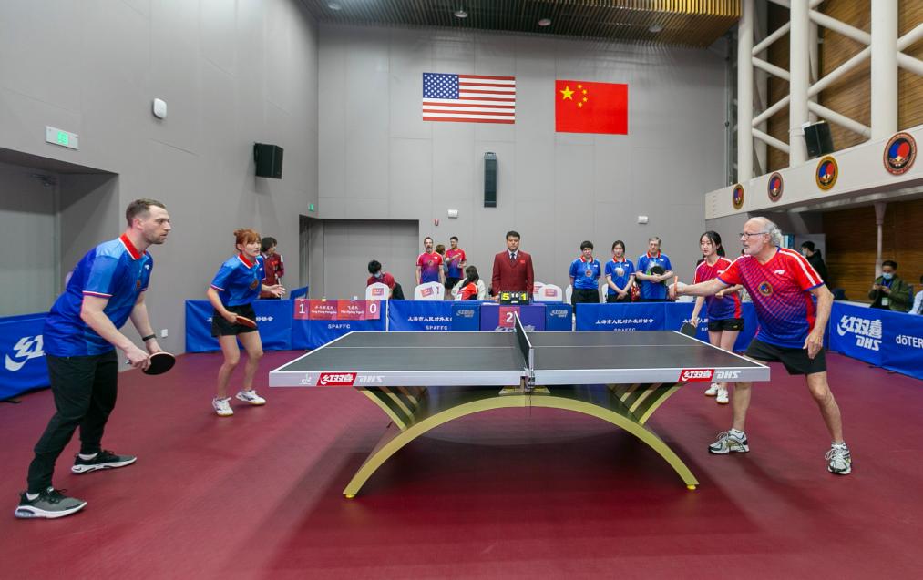 2021年4月10日,上海举行纪念中美“乒乓外交”50周年系列活动。这是中美选手参加乒乓球友谊赛。新华社记者王翔摄