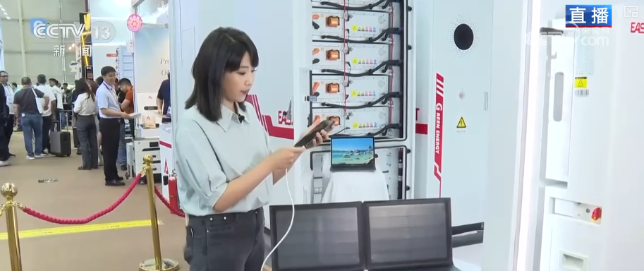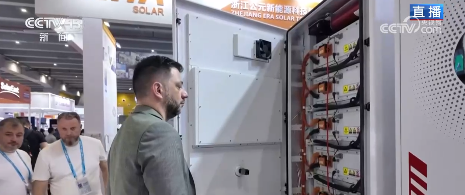 看完便携好物,再来看看这个大家伙,它就是“AI能源管理+储能系统”,是用在工厂里的省钱方案。我们都知道,光伏发电是看天吃饭,白天有电晚上没辙,高峰不够用、低谷又浪费。这套系统接入了AI之后,就能精打细算、智能核算。系统会预测工厂的用电高峰,自动算出光伏该发多少电、储能该放多少电,让每一度电都用在刀刃上。据了解,这两天,这个展位吸引了很多来自东南亚、非洲的代理商来咨询。展位在第一天是有3个工作人员,他们根本忙不过来,第二天直接加足人手,配上了10个工作人员来对接海外客商。