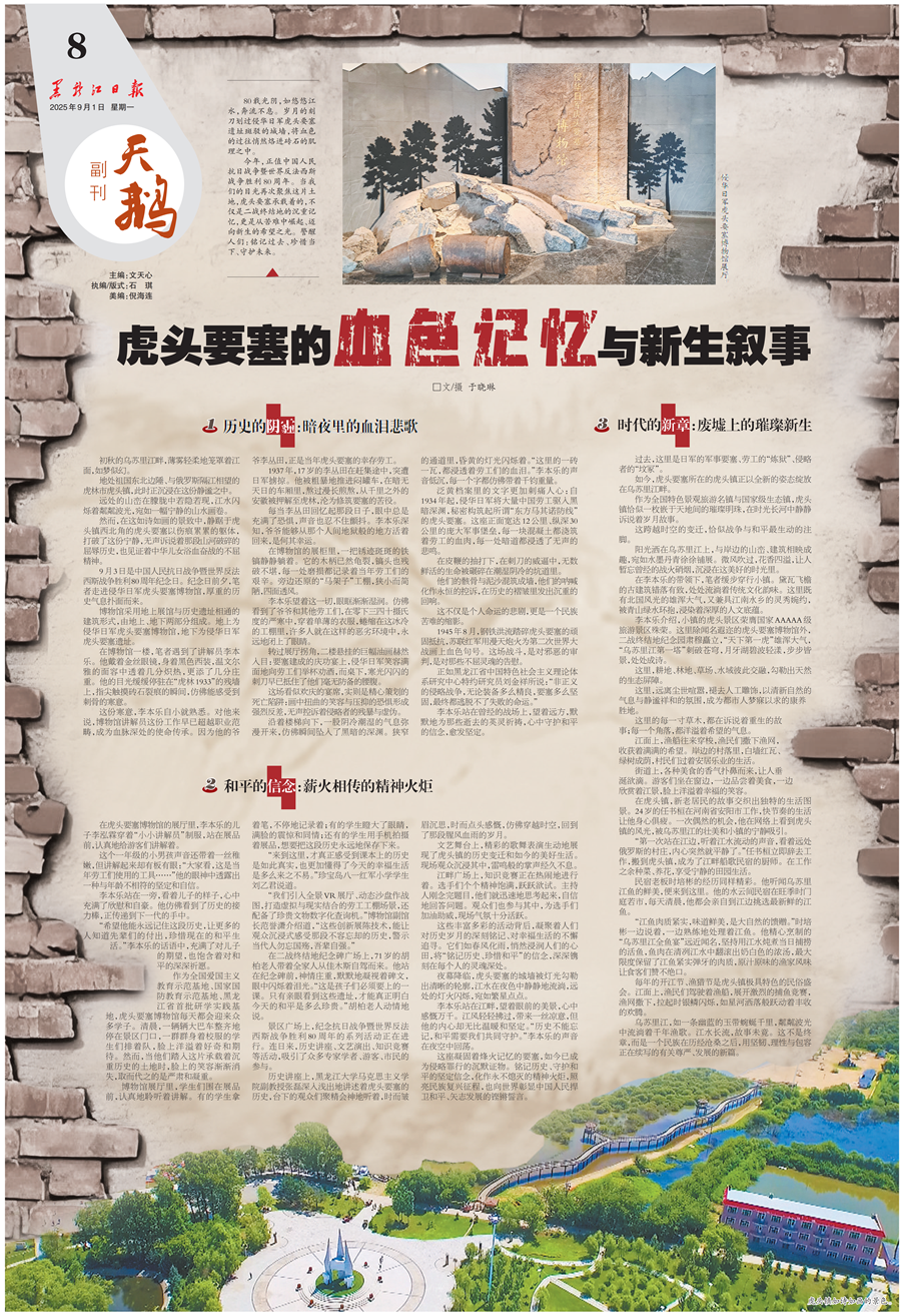 2025年9月3日是中国人民抗日战争暨世界反法西斯战争胜利80周年纪念日。虎头要塞作为第二次世界大战的终结地,是见证历史转折的关键坐标。在纪念日前夕推出《虎头要塞的血色记忆与新生叙事》整版报道,恰逢其时,意蕴深远。 记者深入侵华日军虎头要塞遗址、二战终结地纪念园等地实地探访,触摸历史脉动,感悟和平新生。作品以“历史的阴霾”“和平的信念”“时代的新章”三个篇章铺陈叙事,串联起跨越时空的家国记忆。文章结构严谨、脉络清晰、行文流畅、情感真挚,配以“砖墙”与“新生”的版面设计,视觉对比强烈、冲击力十足,兼具历史厚度与时代温度。 该作品入选中国副刊微公号烽墨长歌副刊代表作展播,引发广泛关注。稿件在龙头新闻客户端同步推出,传播力强劲,被全国党媒信息公共平台、东北网、读特客户端等10家新媒体平台同步转载,实现跨平台、广覆盖传播。内容精准触达不同受众群体,有效传递抗战胜利80周年的时代意义,弘扬和平理念与爱国精神。 |
