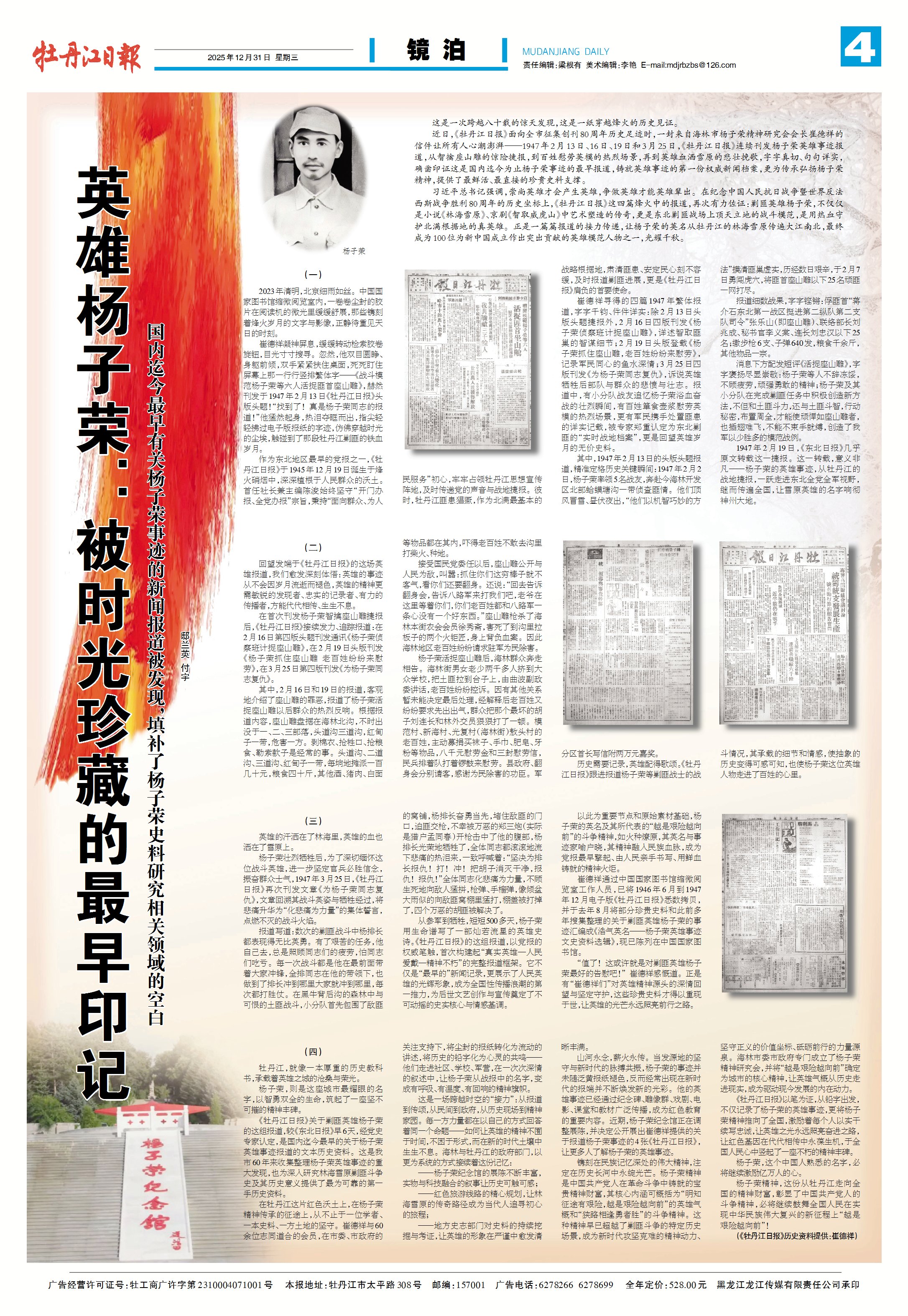 《英雄杨子荣:被时光珍藏的最早印记》是一篇报告文学。杨子荣是100位为新中国成立作出突出贡献的英雄模范人物之一。文章写于抗战胜利80周年与牡丹江日报创刊80周年的重要历史节点。记者以强烈历史责任感与新闻自觉,聚焦从牡丹江走出的英雄杨子荣,走访征集见证材料,从海林市杨子荣精神研究会会长崔德祥处,独家发现尘封近80年的四篇原始报道。记者坚持“史海钩沉、考据为证”,持续追踪线索,逐字比对报样,还原历史语境,并联动地方史志专家多重交叉认定,证实其为国内迄今最早系统记载杨子荣事迹的权威新闻档案,填补重要史料空白。 该作品以严谨调查与生动叙事还原英雄事迹从林海雪原走向全国、铸就精神丰碑的历程,展示了新闻真实记录的英雄可感可知的历史细节,兼具思想性、新闻性与艺术性,是地方党报践行“四力”、深耕本土红色资源的力作。 作品刊发后,迅速引发强烈社会反响,获市委、市政府及省、市两级党史专家与杨子荣精神研究界的高度认可,被多家媒体转载,传播效果显著,推动杨子荣精神深度融入中国共产党人的精神谱系,让“越是艰险越向前”的时代精神更加深入人心,充分彰显了党报记录历史、传播主流价值的使命担当,为高质量发展凝聚了磅礴力量。 |