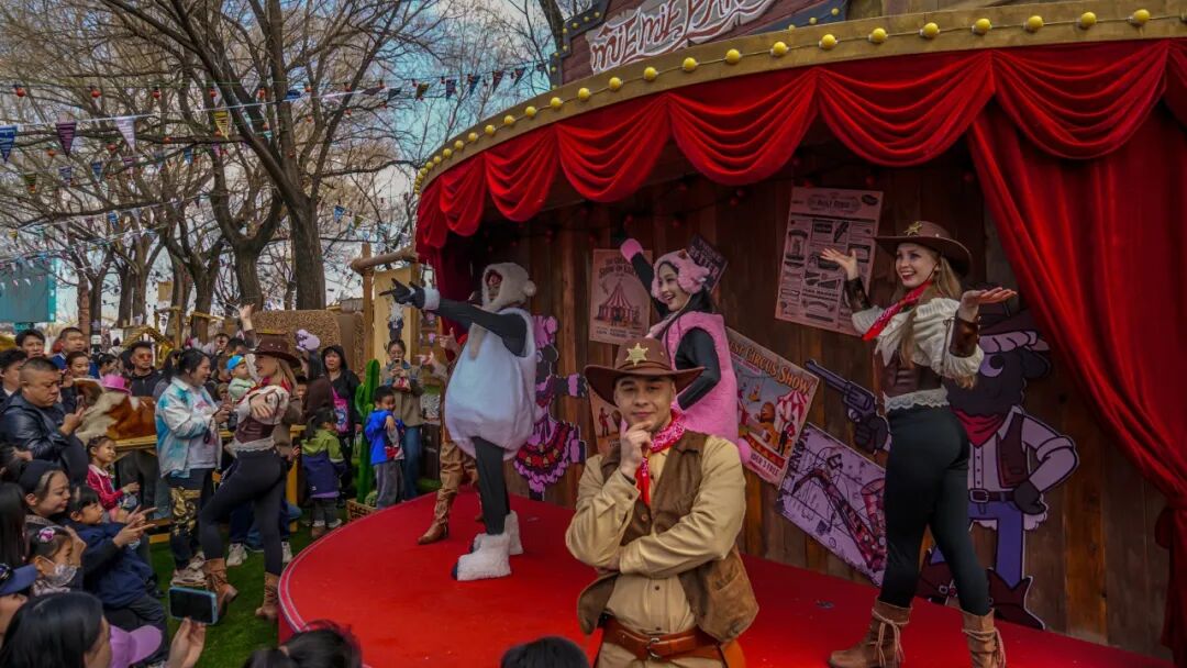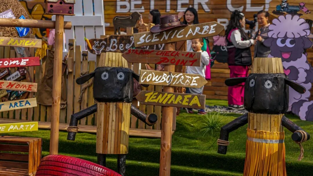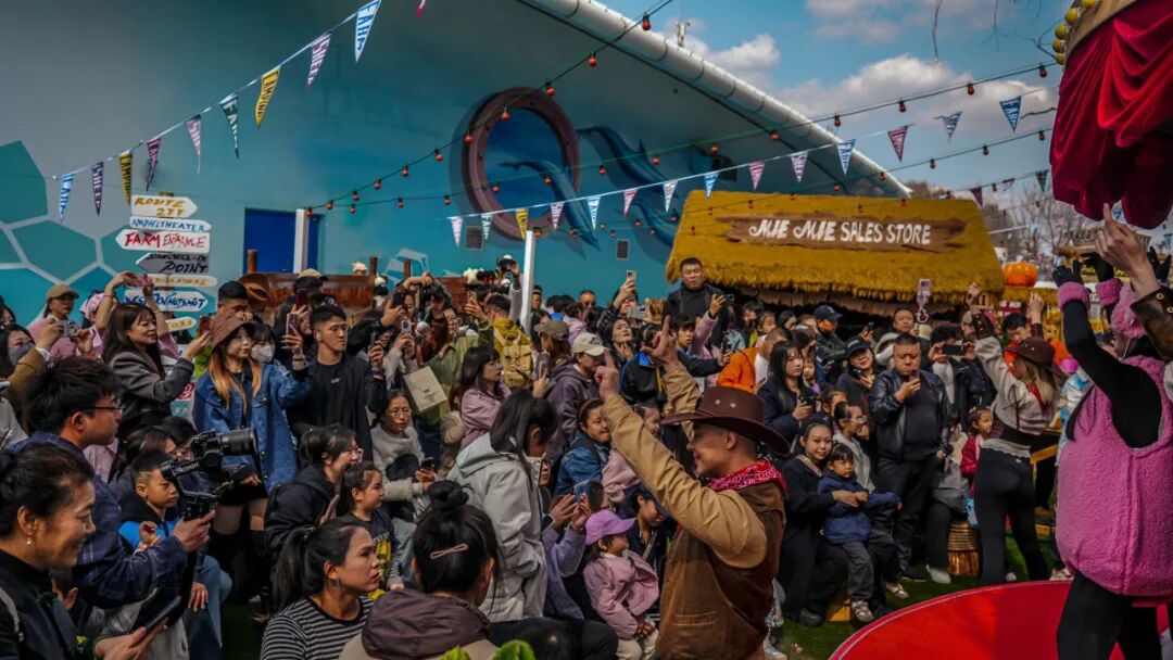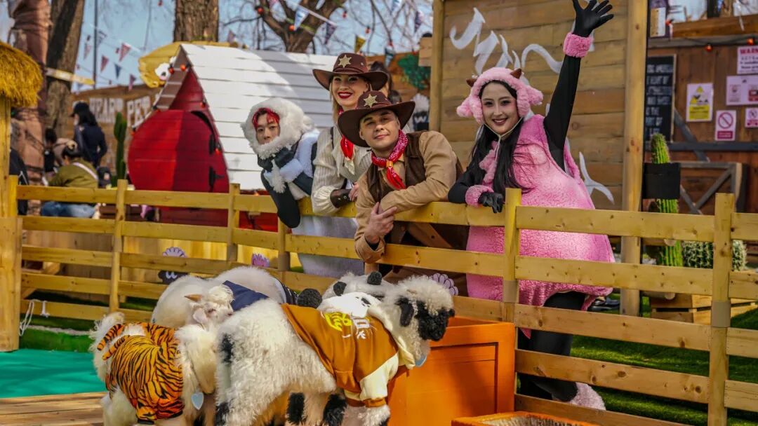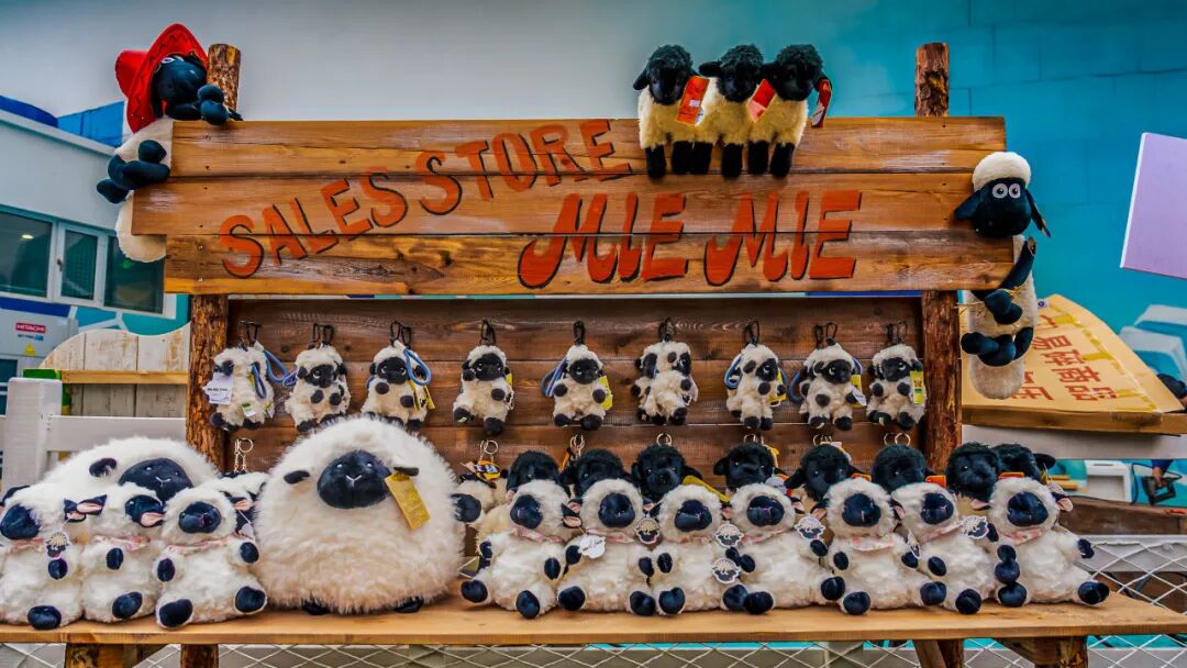 尤为亮眼的是,咩咩农场重磅推出了以瓦莱黑鼻羊为原型的原创动物IP——“夹克”与“肉丝儿”。这对呆萌可爱的IP形象不仅作为农场的专属文化符号遍布各处,更衍生出系列原创IP音乐、主题歌舞演出及丰富多样的文创周边。在咩咩舞台区域,原创小羊主题音乐歌舞演出精彩上演,牛仔NPC化身农场伙伴与游客亲密互动,让欢乐氛围持续升温。游客还可前往文创市集区挑选心仪的IP衍生品,或品尝特色主题美食,全方位构建“可看、可玩、可购、可留”的立体化文旅体验。