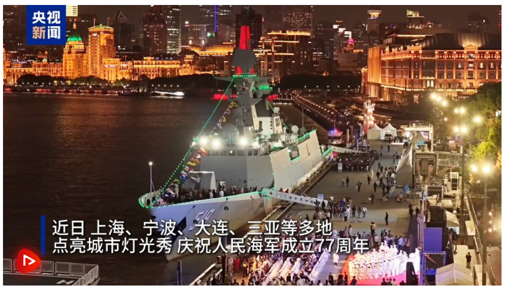 近日,上海、宁波、大连、三亚等地点亮城市灯光秀,庆祝人民海军成立77周年。在各地地标建筑上,璀璨的灯光亮起,海军特色徽标符号、标语口号相继而出,向深蓝致敬。